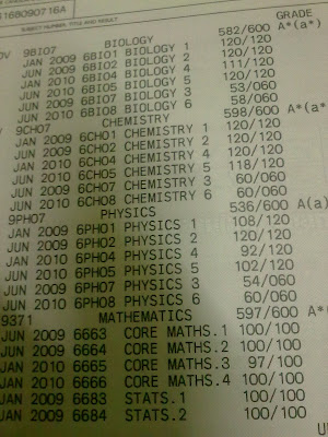 To my surprise, I've successfully secured the 3 asterisks for Biology, Chemistry and Maths. Failing to get an asterisk for Physics is just predictable so I have no special feeling about it when I got to know it's not with an * beside the (A). I'm glad anyway cos overall I'm still an A-student for my A2 Physics though am not as good as some of my really extremist-like mates who have got A* and all full marks (they have robot-built brains, indeed)